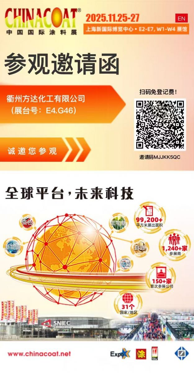 當“碳達峰、碳中和”成為全球涂料行業(yè)的共同命題,一場關(guān)于綠色原料的“革命”正在悄然發(fā)生——衢州方達化工有限公司率先交出高分答卷!2025年11月25-27日,上海新國際博覽中心(SNIEC),方達化工將攜“專注新材料領(lǐng)域,用綠色原料編織低碳未來”的硬核實力,震撼亮相中國國際涂料展(CHINACOAT 2025)E4.G46展臺。